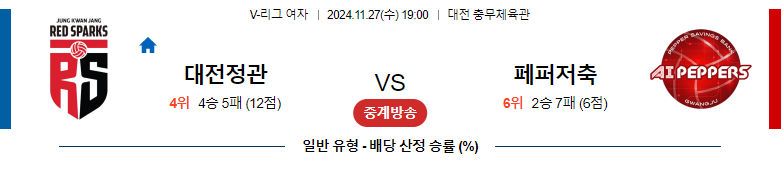 [벳조이]11월 27일 정관장 vs 페퍼저축은행 【V-리그】