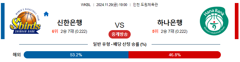 [벳조이]11월 29일 신한은행 vs 하나원큐 【WKBL】