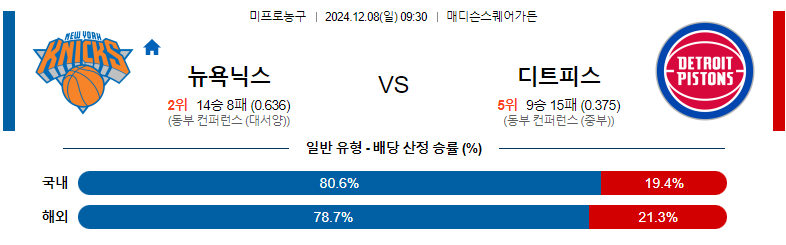 [벳조이]12월 08일 뉴욕 닉스 vs 디트로이트 피스톤스 【NBA】