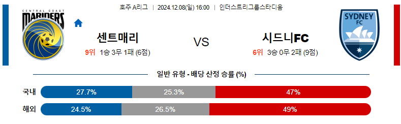 [벳조이]12월 08일 센트럴 코스트 vs 시드니 【호주 1부】