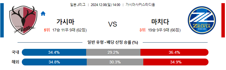 가시마는 점유율을 바탕으로 경기를 지배하겠지만, 마치다의 견고한 수비를 뚫기 어려울 전망이다. 마치다 역시 단순한 공격 전개로 인해 가시마의 안정된 수비를 공략하기 힘들다. 양 팀 모두 순위가 확정된 상황에서 큰 동기 부여가 부족하다는 점을 고려할 때, 무승부와 언더(2.5 기준)가 예상되는 경기다.