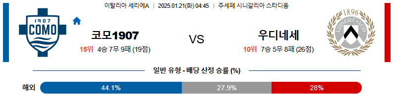 우디네세는 최근 원정에서 2승 2무를 기록하며 좋은 흐름을 이어가고 있습니다. 특히, 선제 실점을 허용하더라도 이를 만회하는 능력이 뛰어나며, 경기 내내 집중력을 유지하는 모습이 인상적입니다. 이번 경기에서도 원정에서의 탄탄한 경기 운영을 바탕으로 코모를 상대로 강한 저항을 펼칠 것으로 예상됩니다.