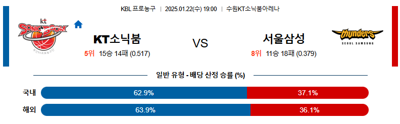 [벳조이]01월22일 수원KT:서울삼성 KBL 분석