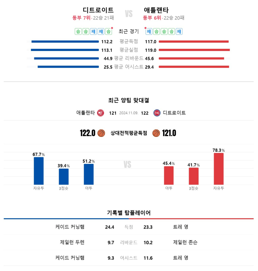 올 시즌 두 팀의 첫 맞대결에서는 애틀란타가 121-122로 패배한 바 있습니다. 현재 부상자는 애틀란타의 재커리 리사처, 제일런 존슨, 트레이 영, 코디 젤러, 래리 낸스 주니어가 있으며, 디트로이트는 제이든 아이비가 부상 중입니다.