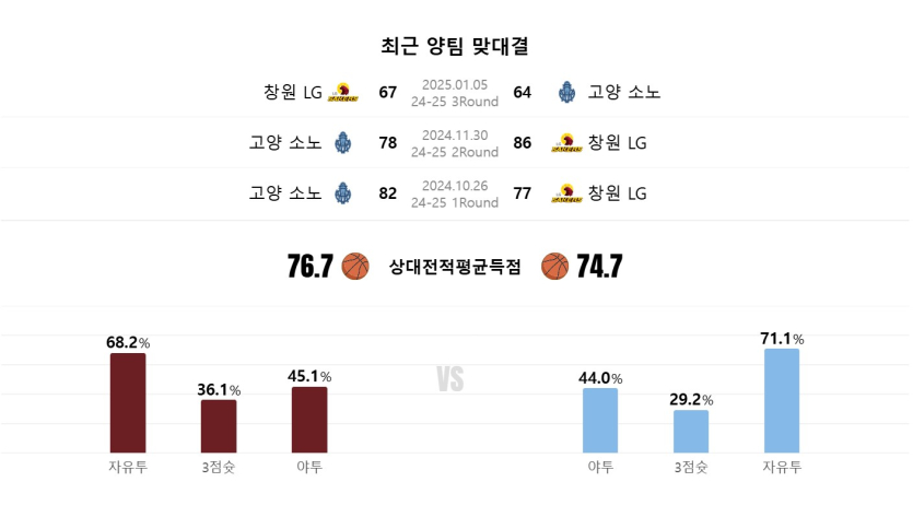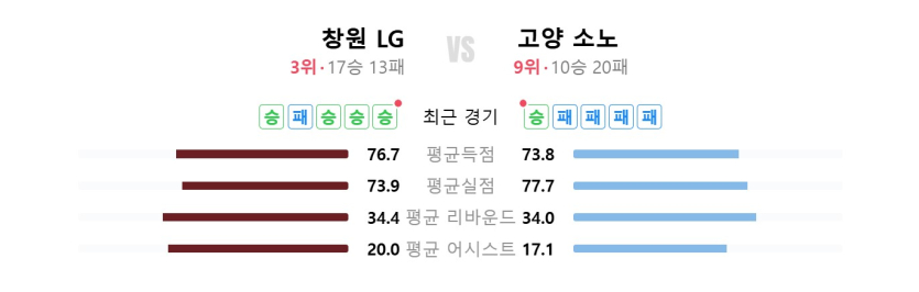 올 시즌 두 팀의 맞대결에서는 창원LG가 2승 1패로 우세를 보이고 있으며, 특히 최근 3차전에서는 창원LG가 67-64로 승리했습니다. 고양 소노는 이전 경기에서 창원LG에 패한 경험이 있어 심리적인 부담이 있을 것으로 보입니다.