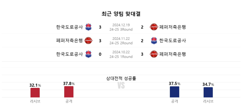 올 시즌 두 팀의 맞대결에서는 페퍼저축은행이 1차전에서 3-0으로 승리했지만, 2차전에서는 도로공사가 3-2로 승리하며 상대전에서 2연패를 끊었습니다. 세 번째 맞대결에서는 도로공사가 3-2로 승리했습니다.
