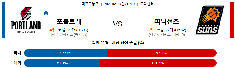 [벳조이 스포츠 분석]02일 02일 12:00 NBA 포틀랜드 트레일블레이저 피닉스 선즈
