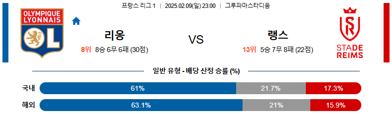 [벳조이 스포츠 분석]02일 09일 23:00 리그앙 올랭피크 리옹 스타드 드 랭스