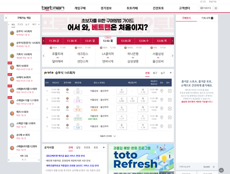 배트맨토토에서 발매되는 게임은 국내외 농구, 축구, 야구, 배구, 골프 등이 있으며 승패 맞히기, 전,후반전 스코어 맞히기 등 다양하게 제공되고 있습니다.