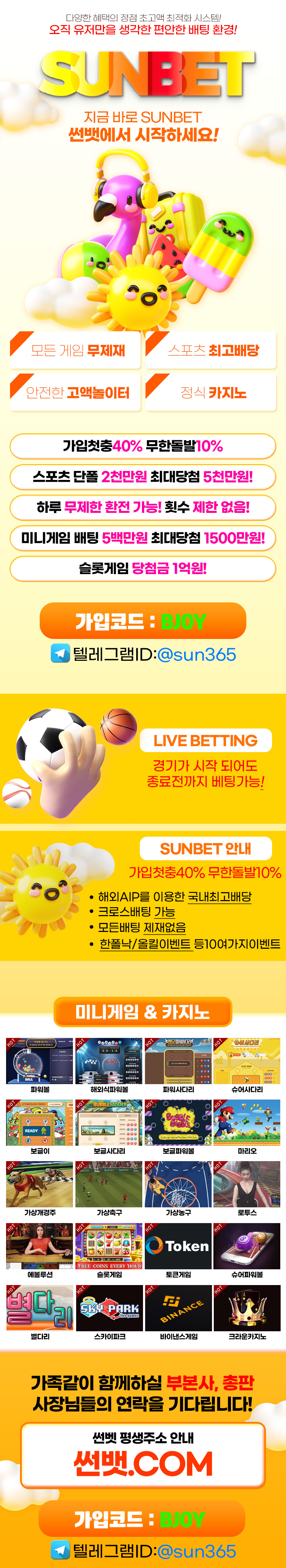 저희 벳조이의 높은 관리기준을 통과한 썬뱃(Sunbet)은 공식 보증업체로써